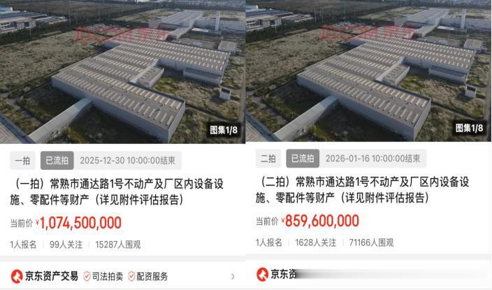 时间回溯至2025年11月10日,因观致汽车长期未能清偿到期债务,江苏省常熟市人民法院一纸裁定,决定拍卖其位于常熟市通达路1号的核心资产。法院委托苏州市天元土地房地产评估有限公司出具报告,将土地、厂房、设备等核心生产资产估值锁定在15.35亿元。基于这一评估价,该资产包于2025年12月30日启动首次拍卖,起拍价10.5亿元,最终因无人问津流拍。2026年1月15日,二次拍卖火速跟进,起拍价进一步降至8.6亿元,仅为法院评估价的56%。